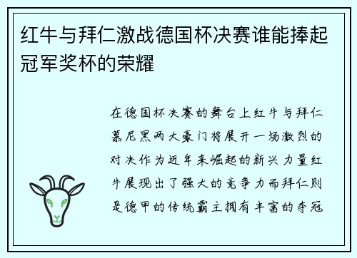 红牛与拜仁激战德国杯决赛谁能捧起冠军奖杯的荣耀